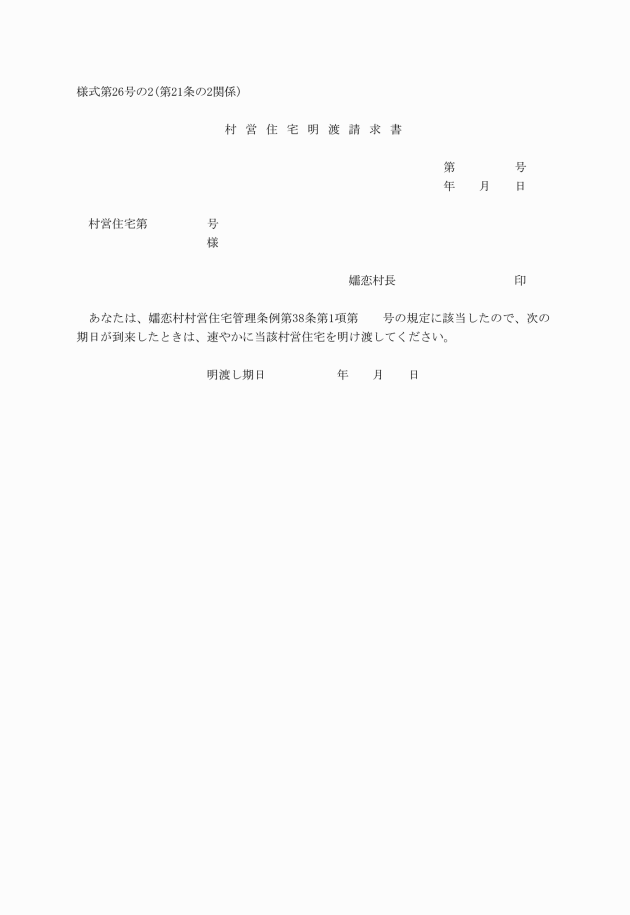 第21条の2 村長は、条例第38条第1項第1号から第6号までの規定により明渡しを請求するときは、村営住宅明渡請求書(様式第26号の2)によるものとする。