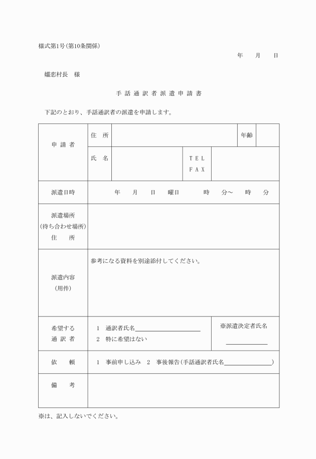 第10条 申請者は、原則として1週間前までに、村へ手話通訳者派遣申請書(様式第1号)を提出しなければならない。受付時間は月曜日から金曜日(土・日、祝日、年末年始は除く。)までの午前8時30分から午後5時30分までとするが、郵送・ファックス等による提出も可能とする。
